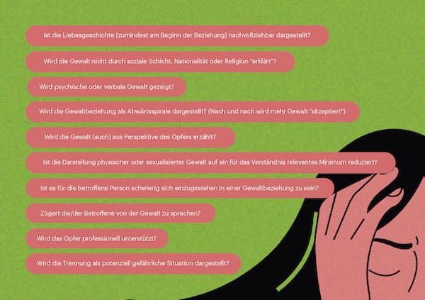 Zeige verschiedene Formen von Gewalt und fokussiere dabei die psychische Gewalt! Zeige körperliche und sexualisierte Gewalt nur so viel wie nötig! Stelle die Gewaltspirale vollständig dar! Beachte die psychische Abwärtsspirale! Erfinde keine Gründe für die Gewalt im Milieu oder in der psychischen Verfassung des/ der Täter:in! Zeige das Opfer als wehrhaft und mutig! Stelle die Perspektive des Opfers dar! Bedenke auch die Darstellung der strukturellen Dimension von Gewalt! Weise auf professionelle Hilfe hin! Bedenke die Folgeerscheinungen von anhaltender Gewalt (während und nach der Beziehung)!