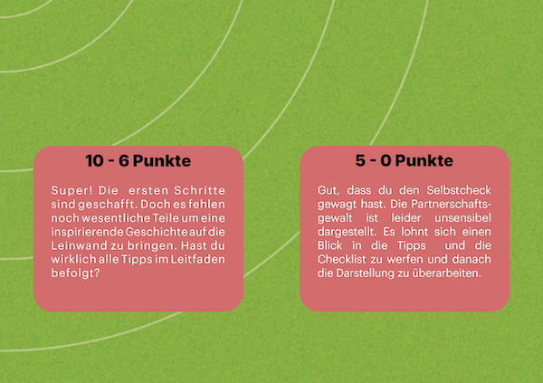 Der folgende Fragebogen bietet einen Kriterienkatalog, der als Instrument zur Analyse filmischer Darstellungssensibilität dient. Er trägt dazu bei, problematische Narrative zu identifizieren und bietet Filmschaffenden eine Orientierungshilfe für einen verantwortungs-bewussteren Umgang mit dem Thema Partnerschaftsgewalt während der Erstellung von Drehbüchern oder in der Vorbereitung auf Dreharbeiten.